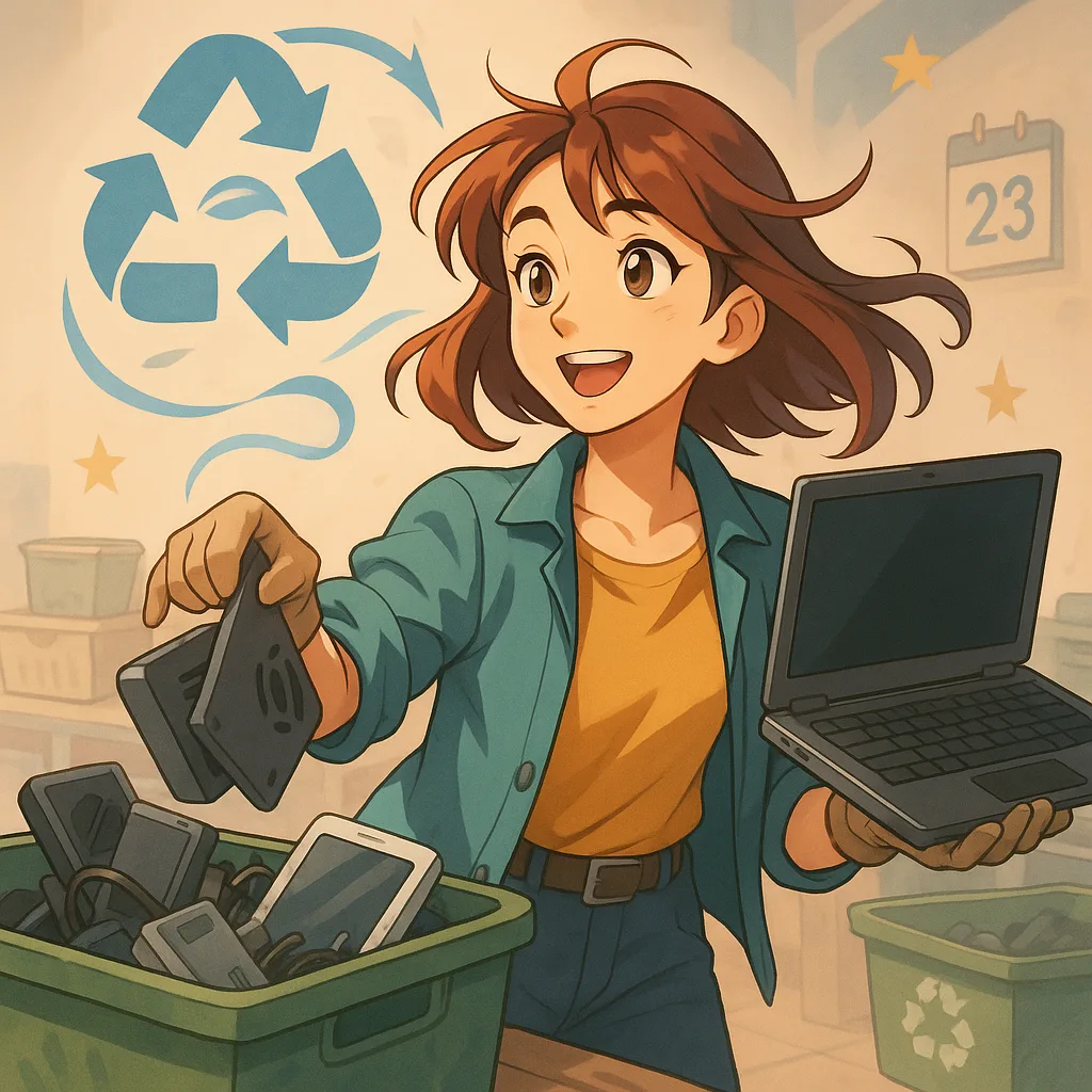 Jeune femme au style dessin animé anime, triant des déchets électroniques (smartphones, laptop) dans des bacs de recyclage, symbole de recyclage en arrière-plan et calendrier de novembre, illustration de la SERD 2025 et de la réduction des D3E.